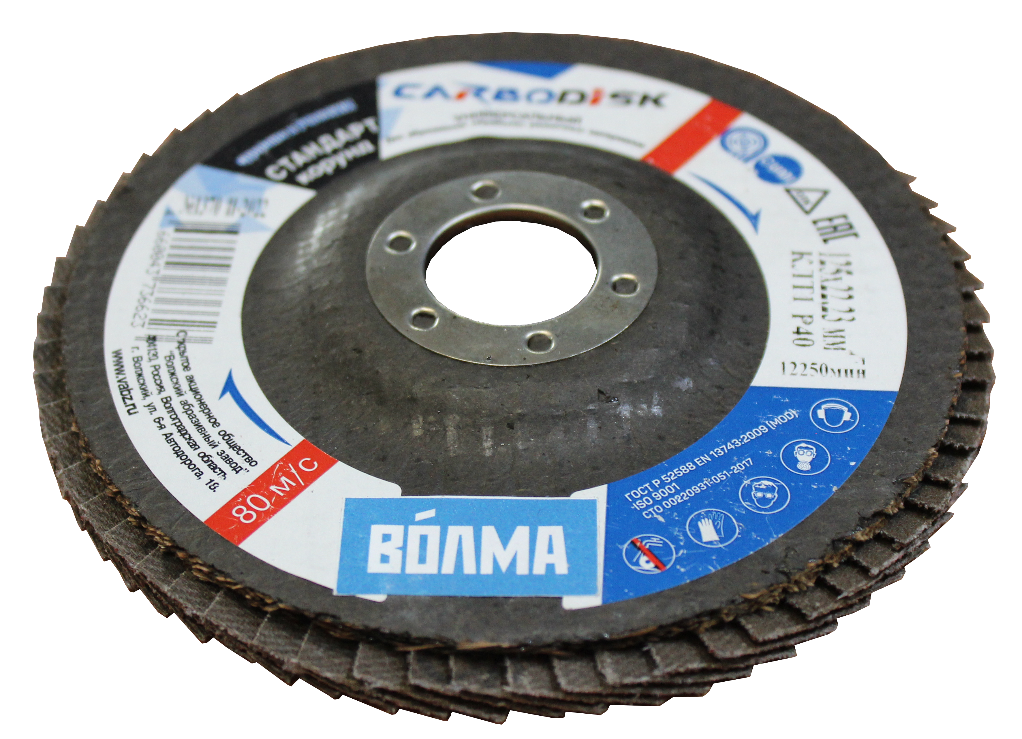 Круг лепестковый торцевой 125х22,23 Сarbodisk представляет собой абразивный инструмент, на опорную тарелку которого равномерно уложены ламели (лепестки) из абразивной ткани (электрокорунд нормальный).